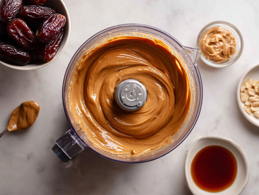 In a food processor, blend the peanut butter, dates, and maple syrup until smooth. Pour this wet mixture over the dry ingredients and mix well until everything is evenly coated and sticky.