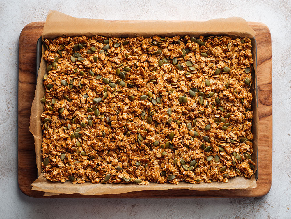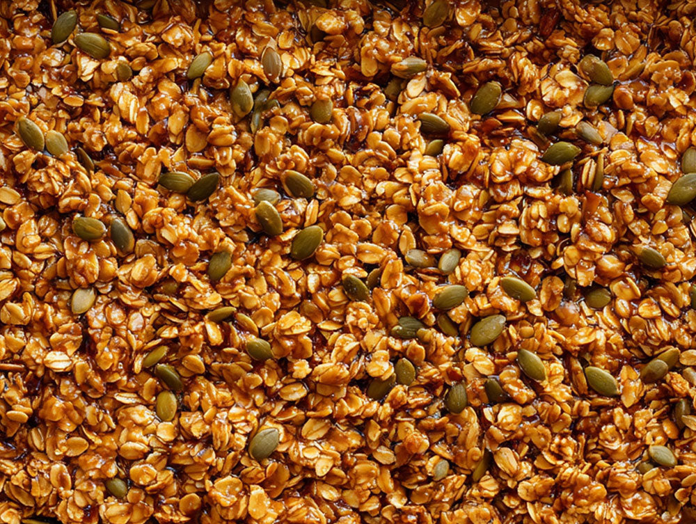 Preheat the oven to 200°C (180°C fan-assisted). In a large mixing bowl, combine the oats, raisins, hazelnuts, pumpkin seeds, sunflower seeds, cinnamon, and ground chia seeds.